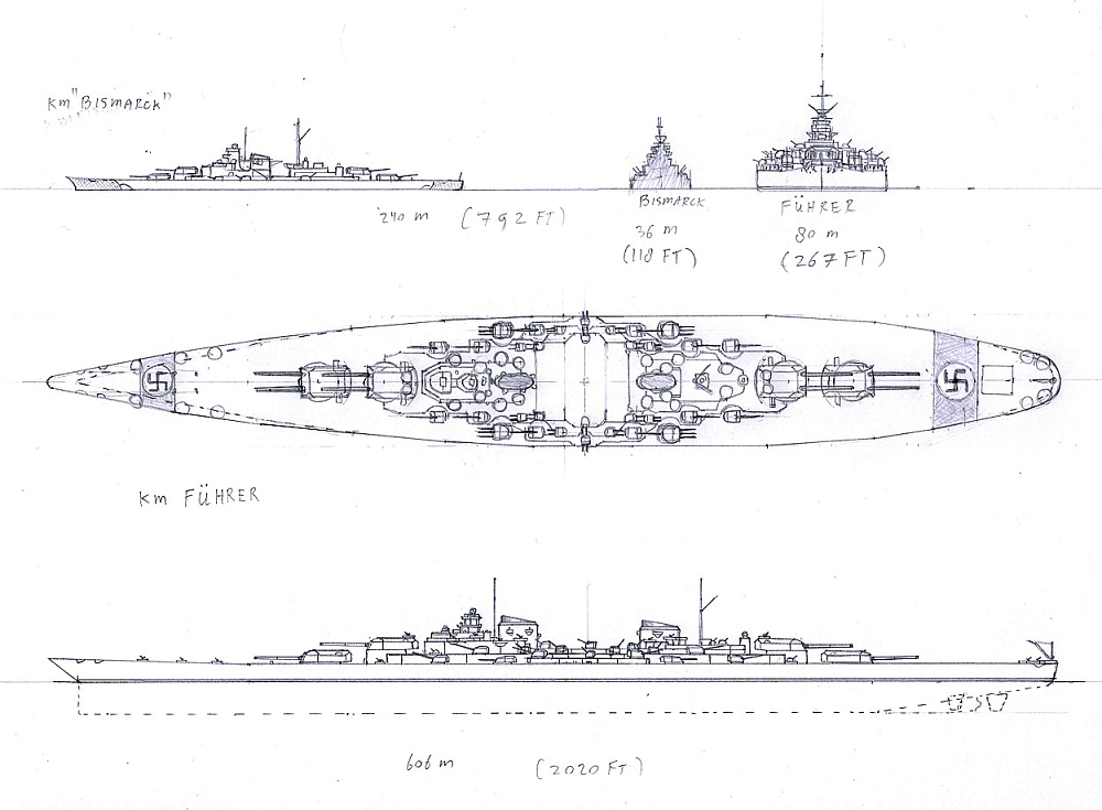 満載排水量は617,000トンとされています(「ビスマルク級」戦艦の満載排水量は50,300トン、「大和級」は72,800トン)。全長609m、全幅91.4m(「ビスマルク級」は全長251m、全幅36m、「大和級」は全長263.4m、全幅38.9m)、480,000馬力の機関(後述の航続距離から推測しておそらくオールディーゼル?)を搭載し(「ビスマルク級」の機関出力は137,000馬力、「大和級」は150,000馬力)、8軸推進で28ノットの速力を発揮する設計でした。航続距離は20ノットの速力で30,000浬(「ビスマルク級」は19ノットで8,525浬、「大和級」は16ノットで7,200浬)でした。
