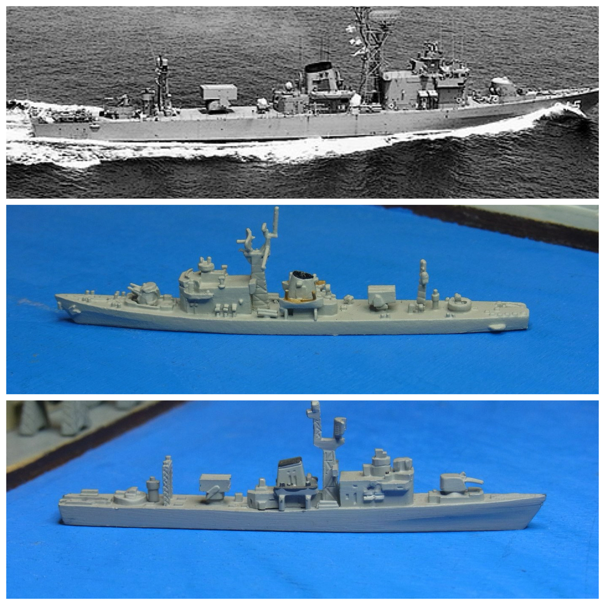 艦首形状の修正と舷側のナックル・フレアの除去、艦尾に向けてややすぼんでいる艦尾形状の修正と艦尾甲板のモールド(可変深度式懸吊型ソナー施設?)の除去を行い、代わりに爆雷投射軌条と投射機を搭載しました。さらに船体全体に前述の「腰高感」を補正するために、喫水部分にやすりがけをして高さを調整しています。